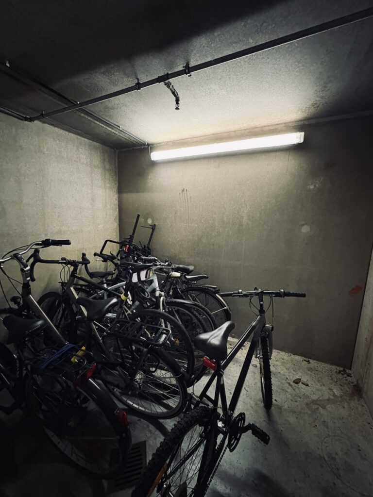 The property is rented fully furnished and also includes a private cellar and a covered parking space. A secure bicycle storage room is available to the occupants.