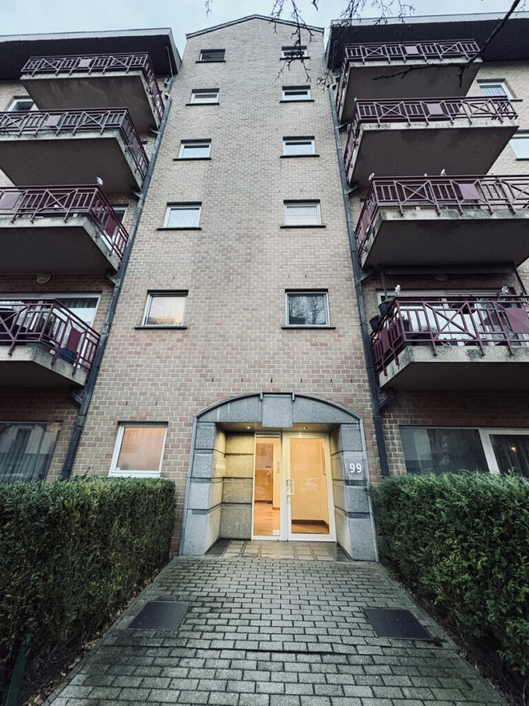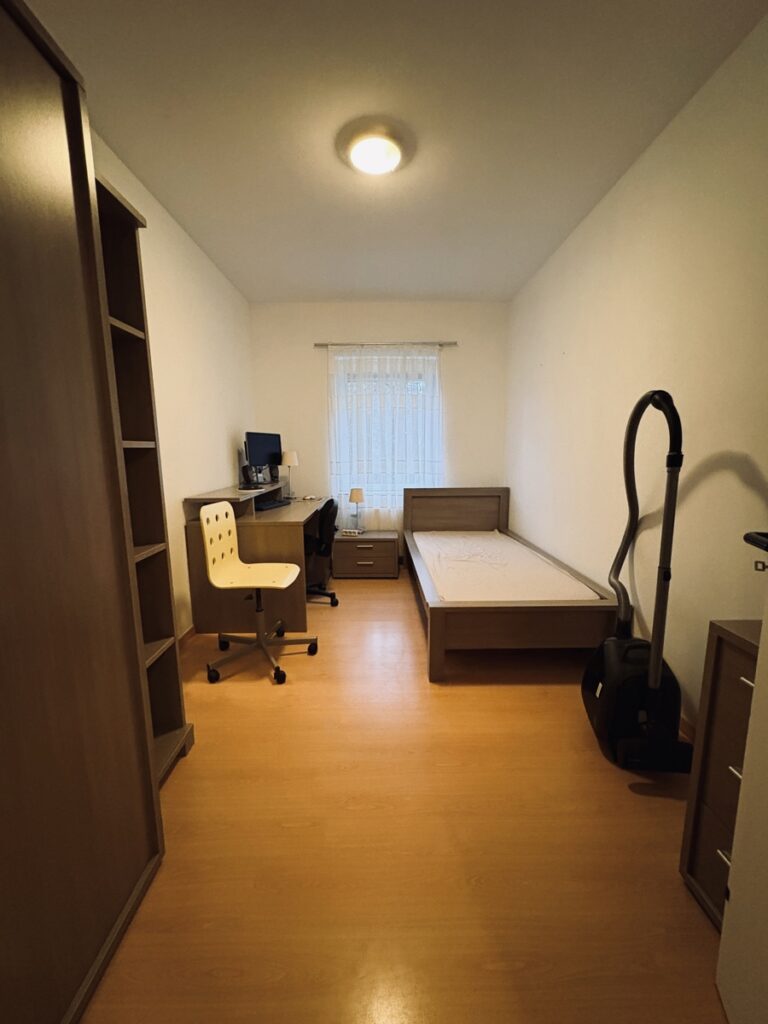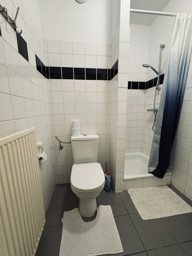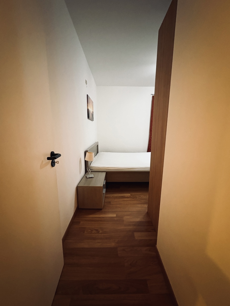 The apartment comprises an entrance hall with a separate toilet, leading to a spacious and bright 32 m² living room, ideal for relaxation and socializing. The fully equipped 12 m² kitchen includes all necessary appliances, including a washing machine and a dryer.