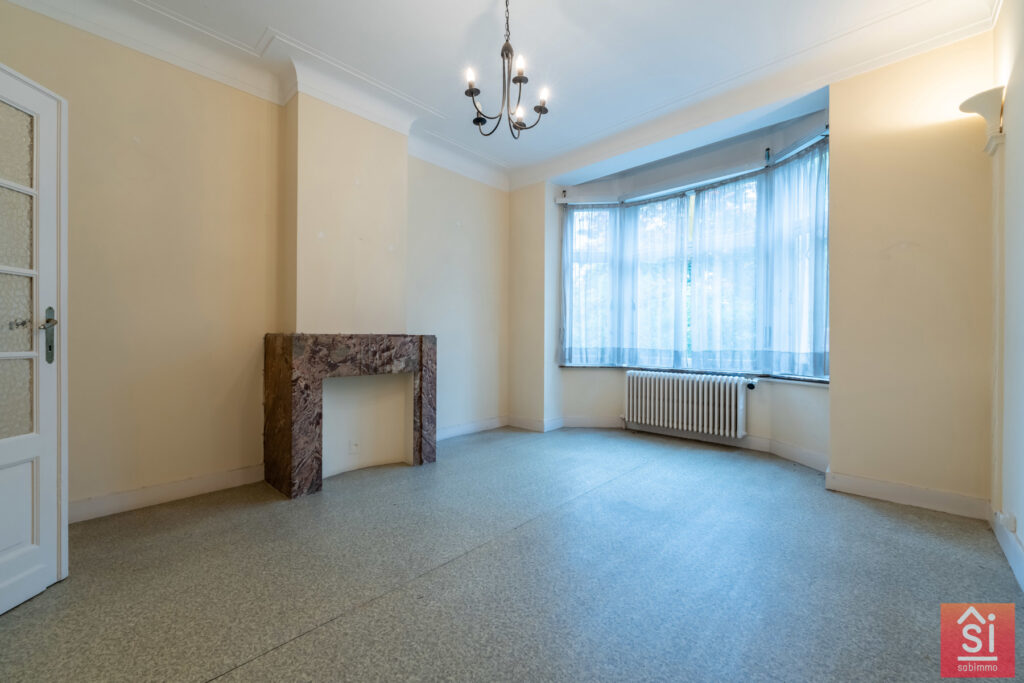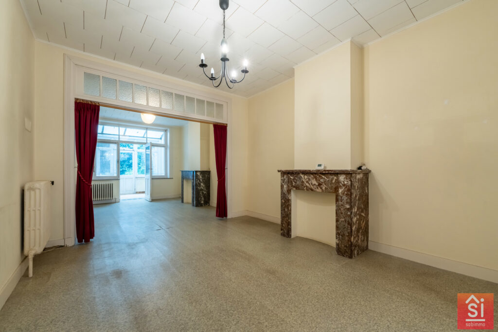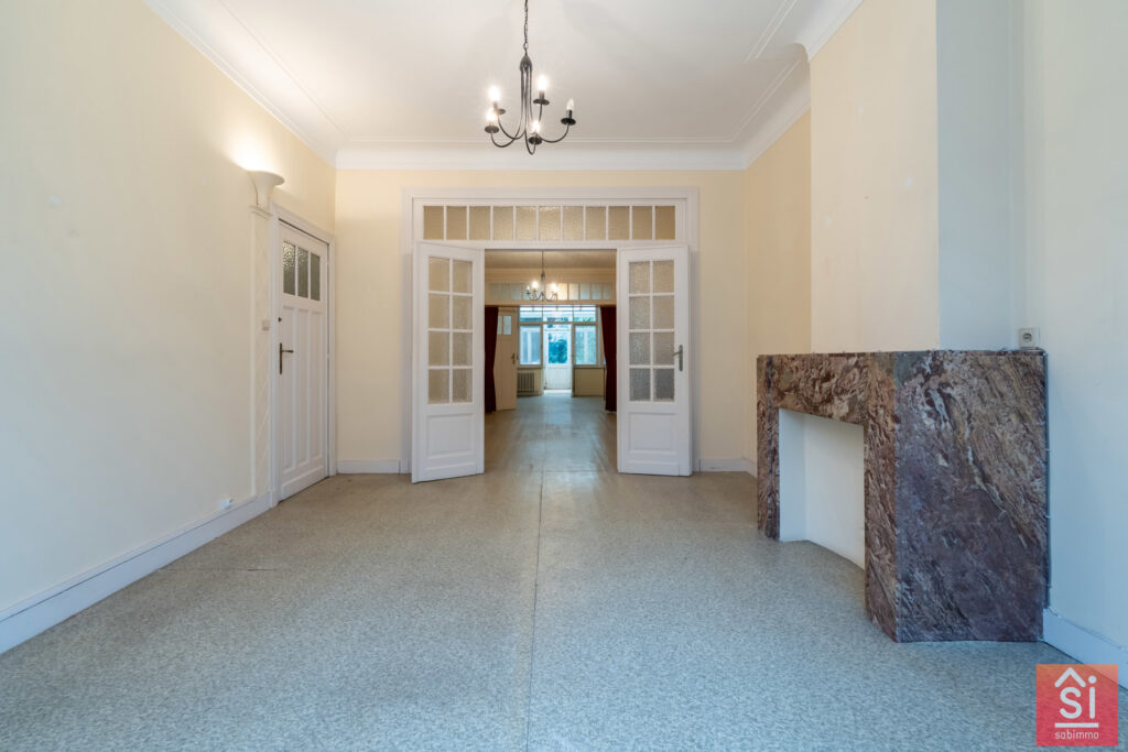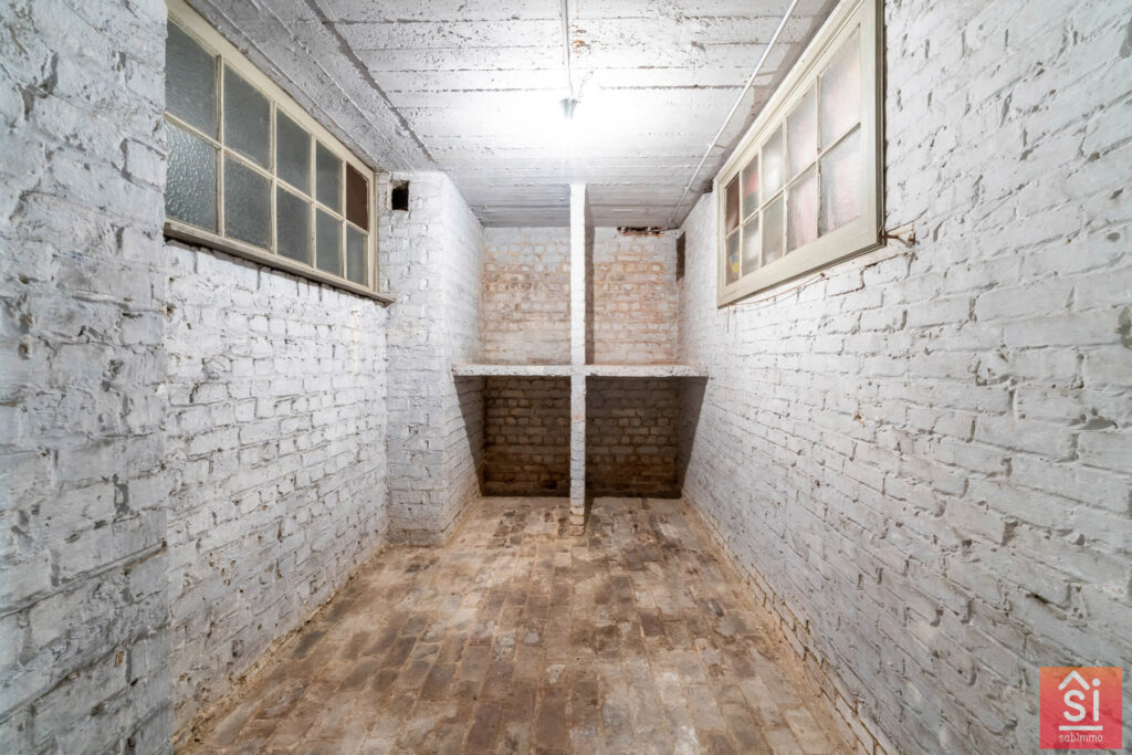 Ground floor : entrance hall, 3 large adjoining rooms (bedroom, living room, dining room), 1 toilet, 1 separate kitchen, a bathroom, 1 veranda, 1 small garden, cellar, 1-car garage + parking space in front.
