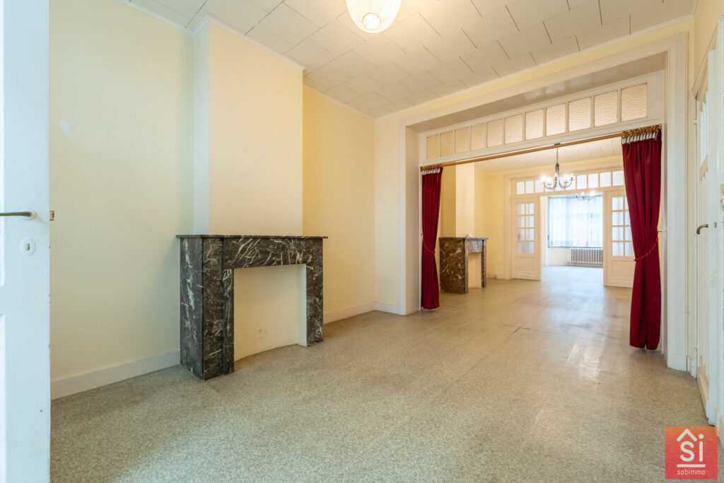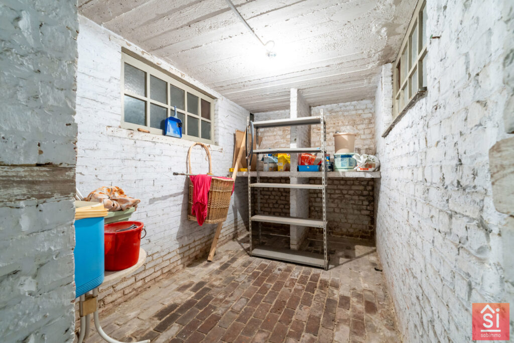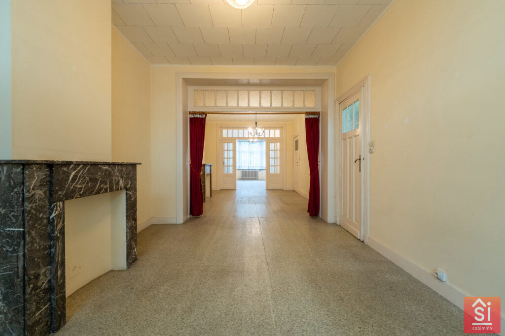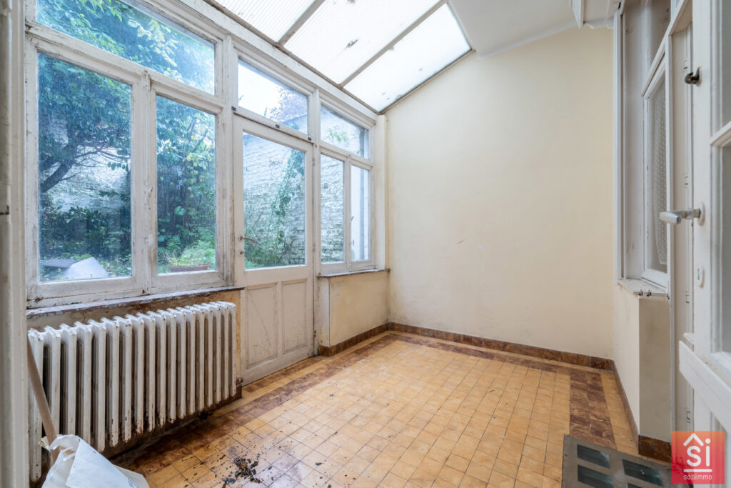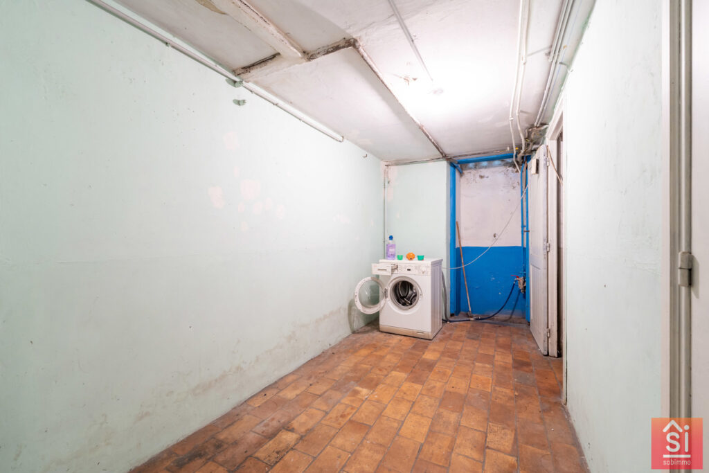Ground floor : entrance hall, 3 large adjoining rooms (bedroom, living room, dining room), 1 toilet, 1 separate kitchen, a bathroom, 1 veranda, 1 small garden, cellar, 1-car garage + parking space in front.