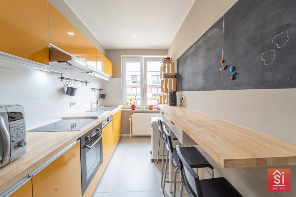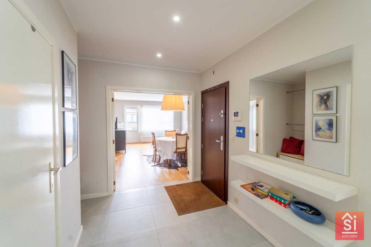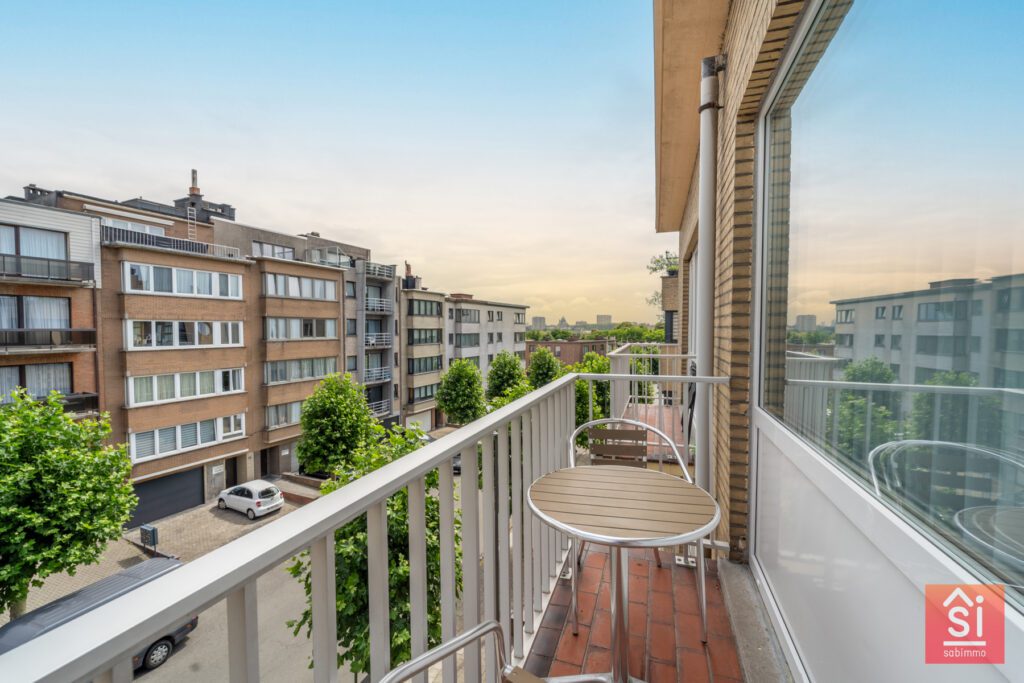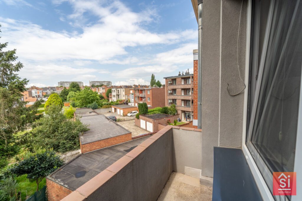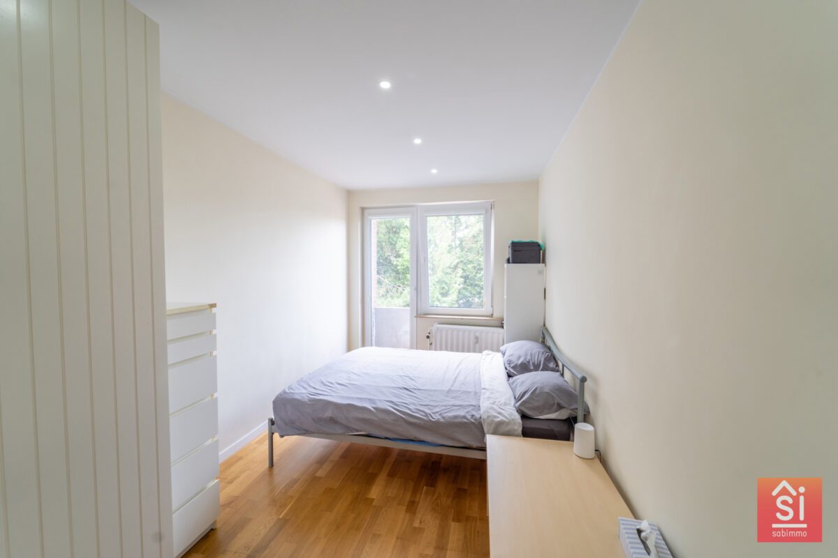 Cet appartement traversant se compose d’un hall de +/- 4 m², un séjour avec de +/- 25 m² avec accès à une petite terrasse avant (3m²), cuisine séparée de 8 m², deux chambres (12 et 14 m²) dont une chambre avec l’accès à un balcon, une salle de bain de +/- 3.5m² et d’un Wc séparé et une buanderie. Cassette avec feu ouvert. Triple vitrage.