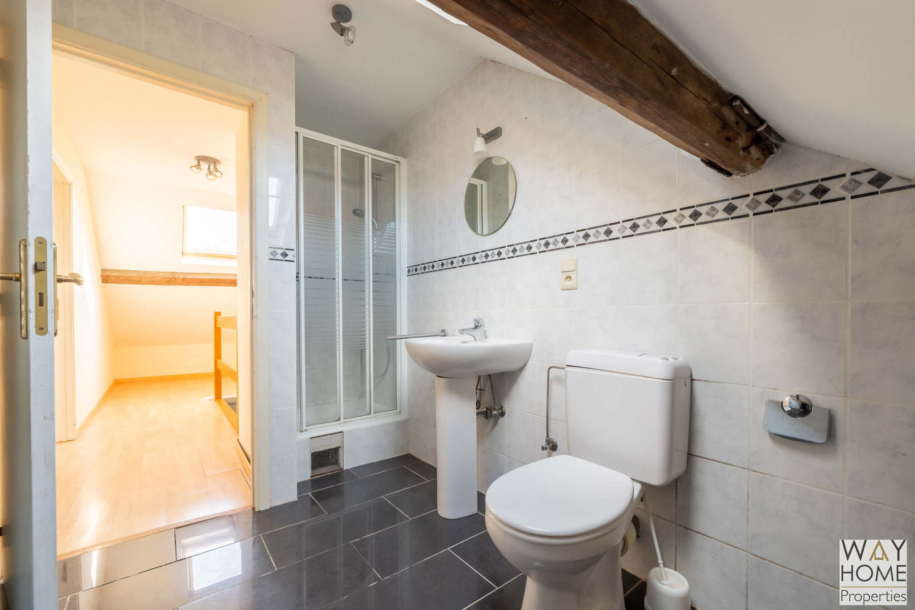 Op de 1e verdieping : hal, 1 badkamer (ligbad, 2 wastafels, 1 toilet), 3 slaapkamers (+/- 15,50 m2, +/- 18 m2 en +/- 27 m2)