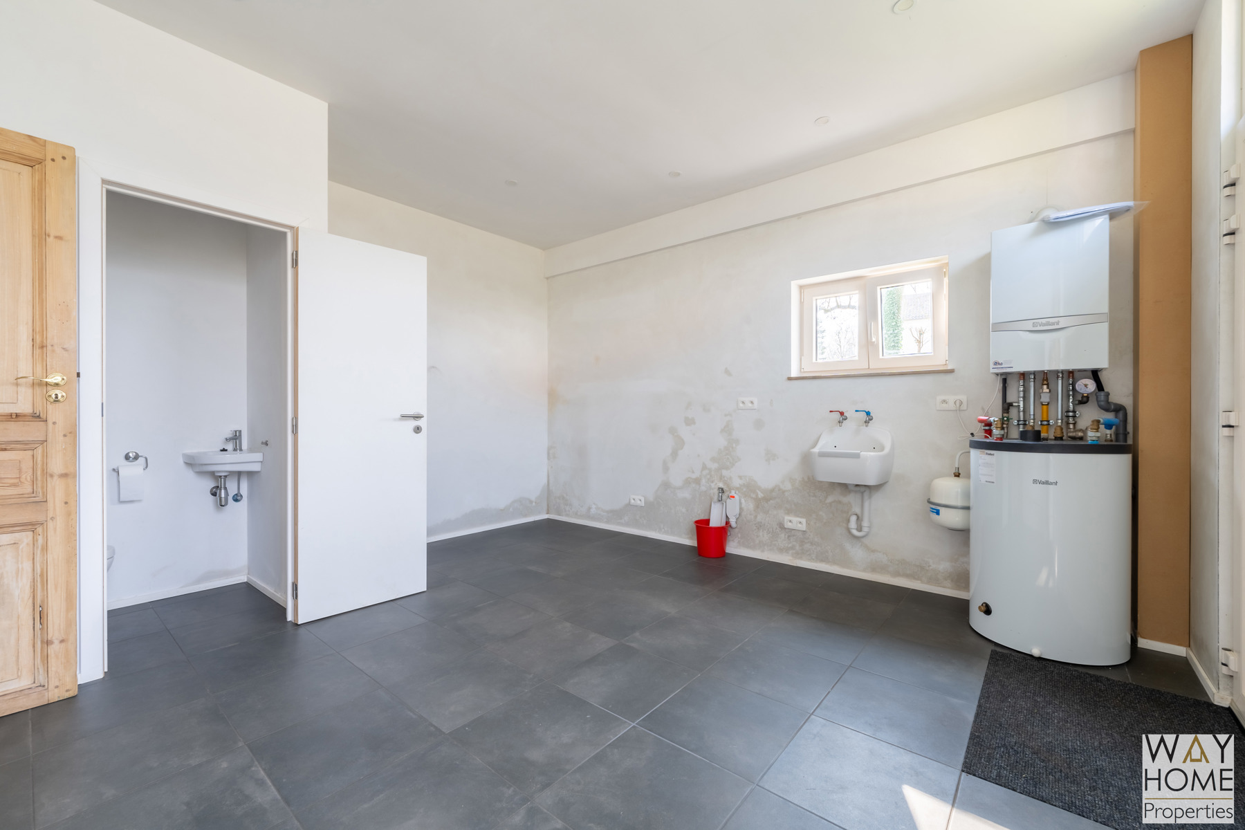 Op het gelijkvloers : inkomhal, bijgebouw/wasruimte, mooie woonkamer van +/- 40 m2 met een aparte keuken van +/- 15 m2, toegang tot de kelder.